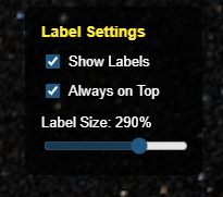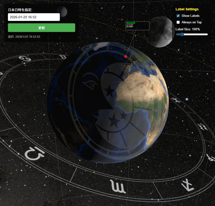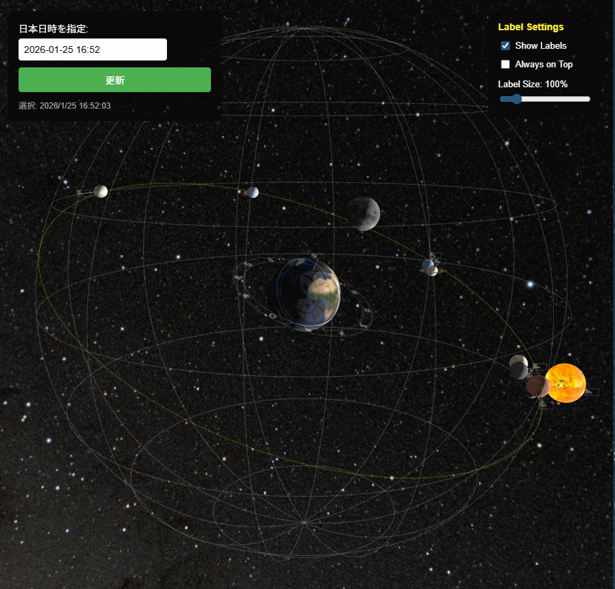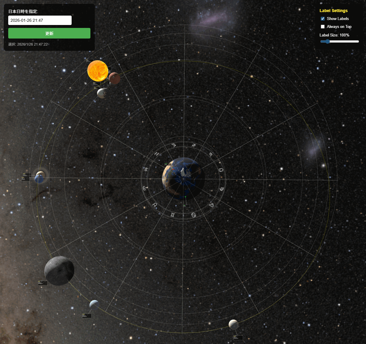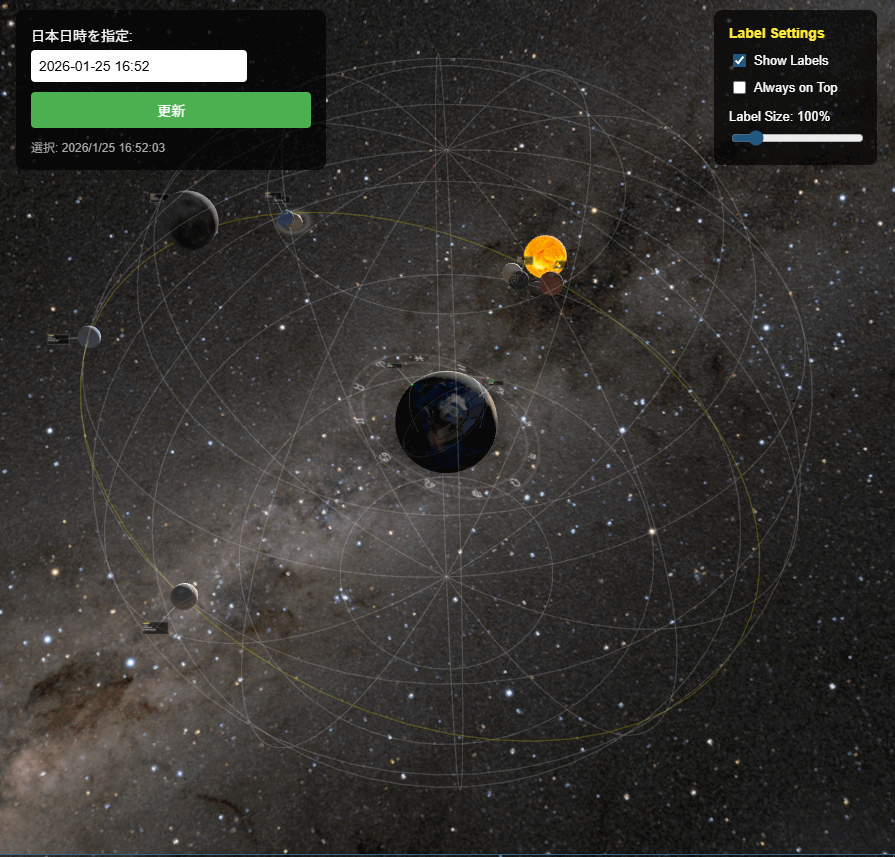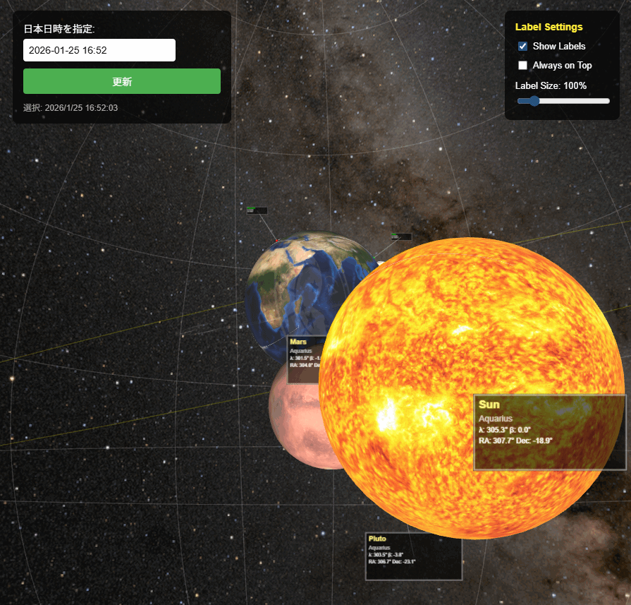 地球には天文台と東京、全惑星には惑星名と位置情報を示すパネルが表示されていますが、位置関係によっては見づらくなるケースもあります。